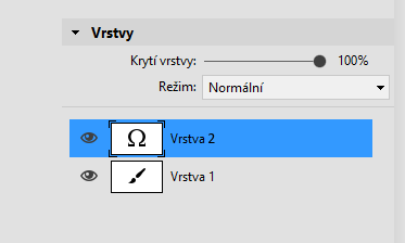 Podívejme se teď blíže, co se stalo, když jsem otevřel vrstvu se symbolem. Karta se změnila. Kromě původní Vrstvy 1 s ikonkou štětce máme Vrstvu 2 s ikonkou symbolu. Tato nová vrstva je modrá. Vlevo je okénko s očíčkem a nahoře je krytí vrstvy a Režim. To vše jsou zásadně důležité věci.