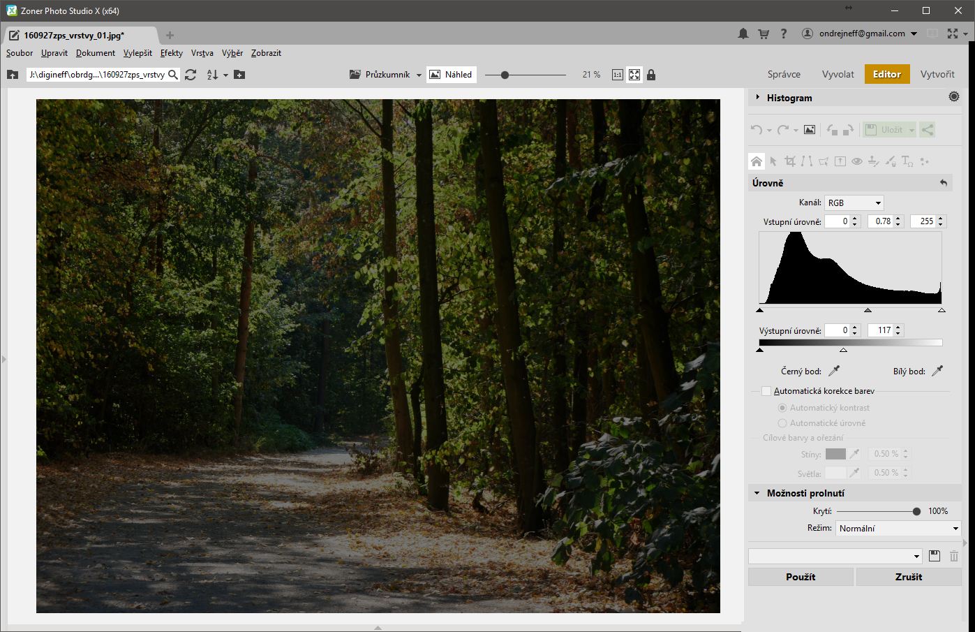 Zkusme jít o krok dál. Zvolím Duplikovat vrstvu a celý obrázek zásadně ztmavím. Chtěl bych posílit efekt pronikání světla do lesa. Duplikovanou vrstvu tedy ztmavím prostoduchým způsobem v Úrovních – posunem středního bodu na Vstupních úrovních doprava a bílého bodu na Výstupních úrovních doleva. Obrázek je tmavý jako bota. Ten spodní není vůbec vidět, je jím naprosto krytý – ale je pod ním! Jakoby dva obrázky ležely na sobě.