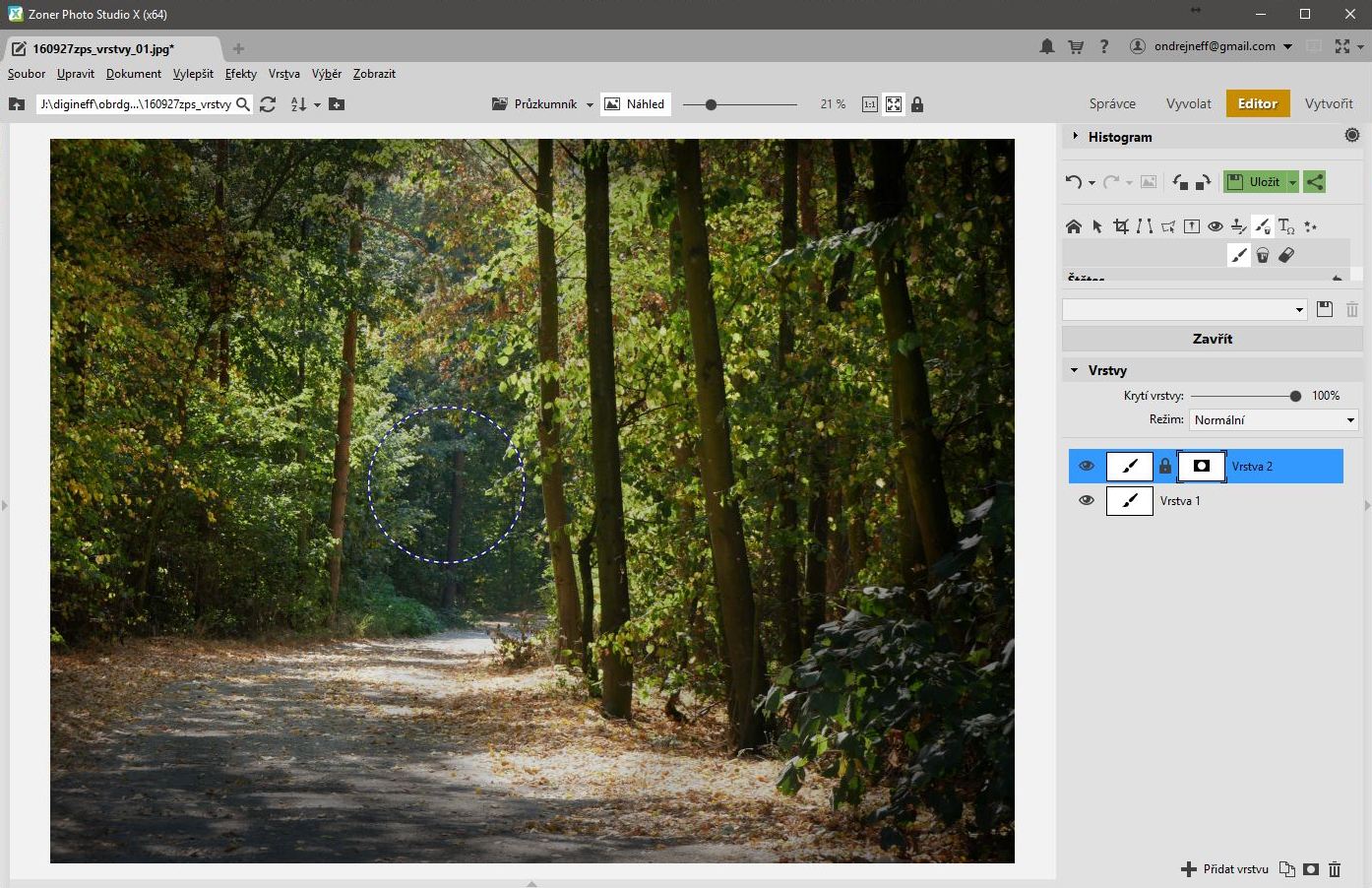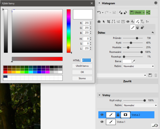 Je ale cesta zpátky? Musí být, musím snadno zase ztmavit to, co jsem zesvětlil – chci si s obrázkem vyhrát, aby plně odpovídal mé představě. Tady je to v ZPS X trochu nešikovné. V photoshopí tradici, jakmile se přepneme do masky, zmizí barvy a jsou jen odstíny šedé, v základním nastavení bílá a černá. Bílá odkrývá, černá zakrývá. Zde zakrývá jakákoli barva – a odkrývá bílá. Tu si musíme vždy v dialogu Štětec navolit.