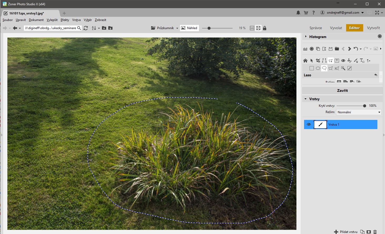 Rád bych něco dělal s tím trsem travin. Zvolím nástroj Laso a bez okolků velmi nahrubo trs obtáhnu. Poté obsah výběru zkopíruju do schránky kombinací Ctrl+C