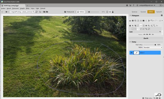 Úprava zasáhla celou plochu výběru. Pomocí masky se snadno nežádoucího zesvětleného trávníku zbavím. Klepnu na ikonu Maska a volím Skrýt vše.