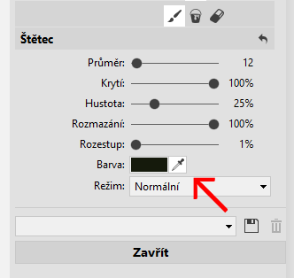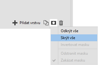 Maluju bílou, protože volba masky Skrýt vše (vidíte, že ikonka zčernala) znamená, že změněná vrstva je překryta maskou, není vidět, zmizela našim očím. Bílý barva odkrývá, tudíž musíme malovat bílou.