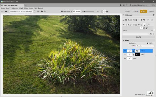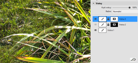 Tuto vrstvu můžeme libovolně upravovat, jak jsme si to ukázali předešle. Například nástrojem Úrovně přetažením jezdce Bílý bod vlevo a jezdce Střední bod vpravo trs travin zvýrazním.