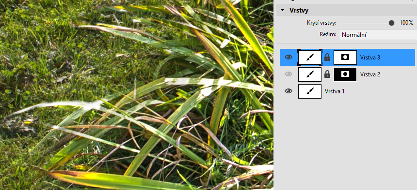 Takto deformovaný trs zase zesvětlím, jak jsme si to už ukázali prve. Všimnete si, že vrstva 2 má vypnuté očko – fyzicky existuje, ale není vidět. Toto je nesmírně důležitá součást práce s vrstvami! Velice nám to uvolňuje ruce k experimentování. Takže tu dvojku jsme schovali pod koberec a pracujeme s trojkou – a vidíme tedy trojku a jedničku.