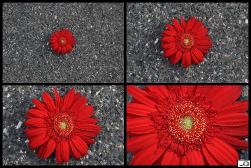 Nicméně, zatím jsme nepřihlíželi k velikosti onoho tvaru v ploše. Zde máme příklad tvaru, umístěného středově, ve čtyřech variantách přiblížení. Ten vlevo nahoře je zřejmě nejméně přitažlivý a nejvíce poutá ten, kde jsme se motivu nejvíce přiblížili.