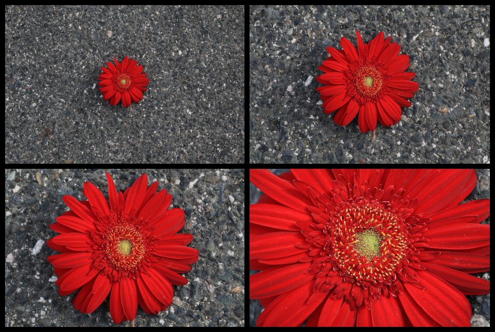 Nicméně, zatím jsme nepřihlíželi k velikosti onoho tvaru v ploše. Zde máme příklad tvaru, umístěného středově, ve čtyřech variantách přiblížení. Ten vlevo nahoře je zřejmě nejméně přitažlivý a nejvíce poutá ten, kde jsme se motivu nejvíce přiblížili.