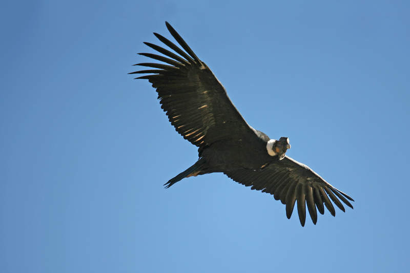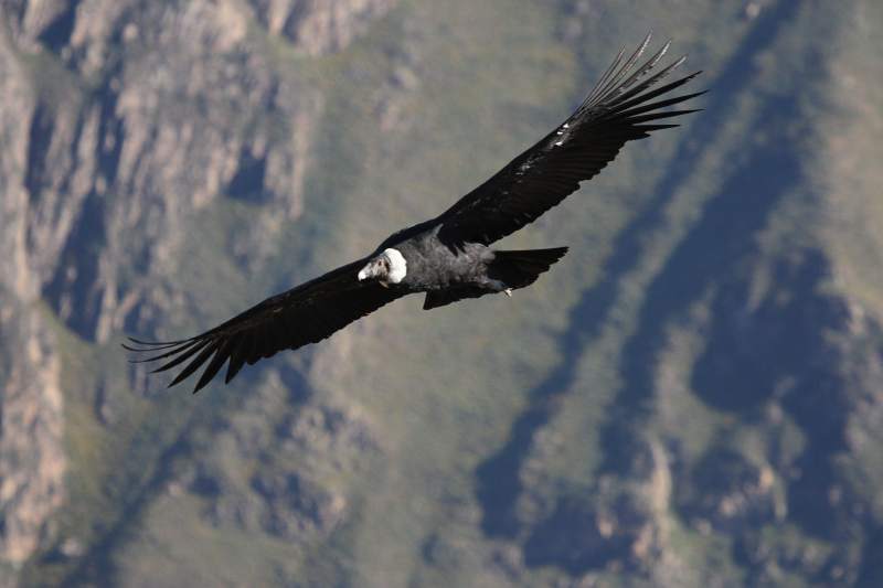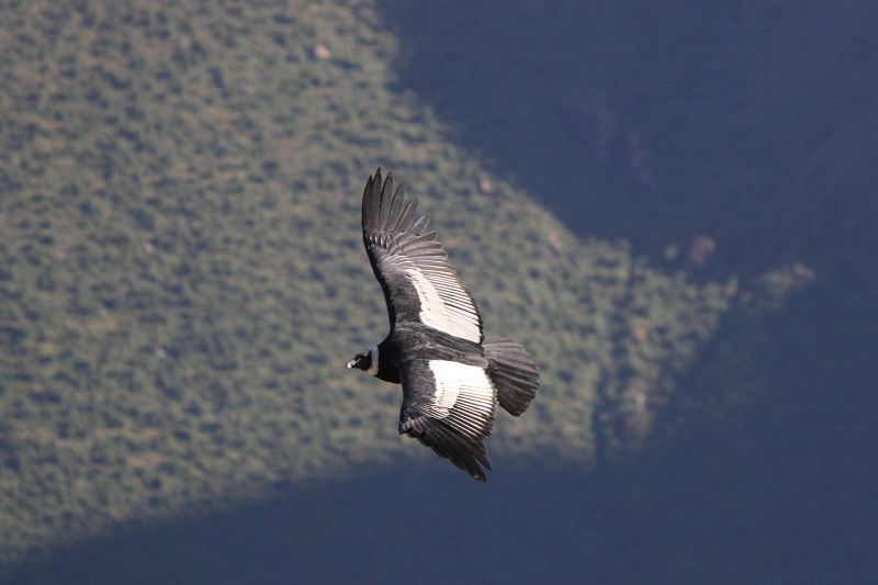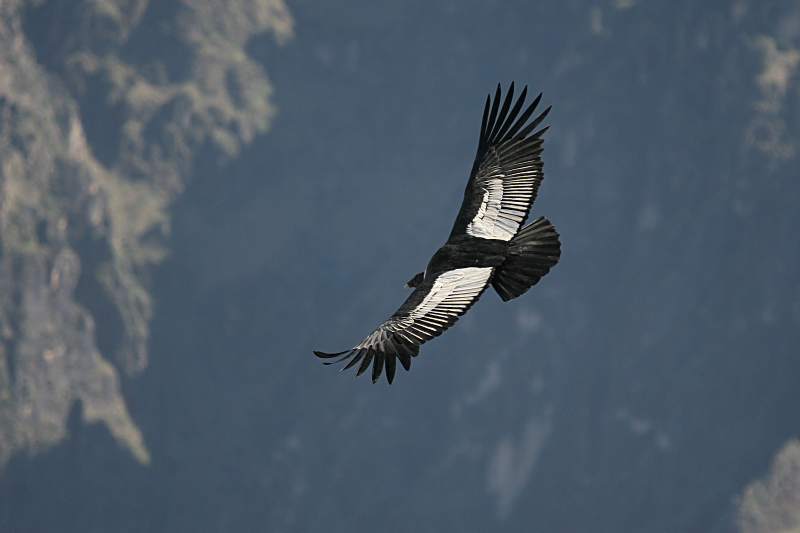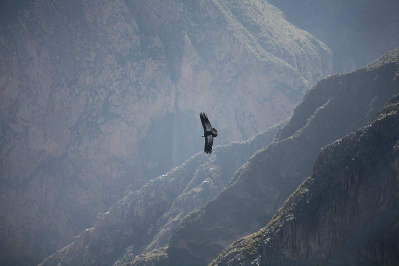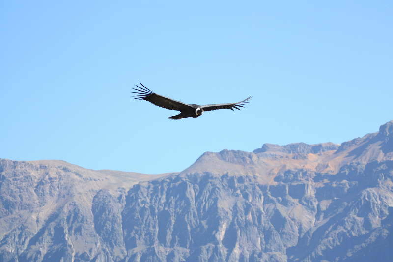 Kondor je obrovský pták, má rozpětí až 3 metry a je poměrně těžký, takže rád si šetří síly a počíná si jako větroň: čeká na stoupavé proudy, aby ho vynesly do výšky. Místo v Colca, kde tito dravci žiijí, je hluboký kaňon se strmými skalními stěnami. Po osmé hodině ranní se vzduch tak dalece ohřeje, že kondoři vylétají, nejdříve ti hodně tmaví, staří jedinci, po nich i hnědá mládež. Letovky čili fotografování ptáků v letu vyžaduje výbavu a cvik. Především je třeba mít dlouhé ohnisko, ekv. 300 mm je rozumné minimum, moje přítelkyně Ljuba Krbová měla na svém Canonu 450D zoom 100 až 400 mm, tedy ekv. 600 mm, takže na tom byla lépe. Je třeba nastavit autofokus na průběžné ostření a rozmyslet si, jak s ostřicím bodem. Myslím, že “střed” to jistí… A nakonec – je třeba si nastavit expozici manuálně, jinak nám bude expozice skákat podle toho, co se při sledování opeřence vyloupne v pozadí, jednou je to jasná obloha, podruhé temné skály naproti. V podstatě je to jednoduché a jde jen o to udržet ptáka v hledáčku. Můžeme si zkusit sériové focení, ale nutné to není.