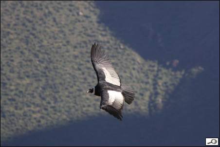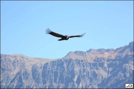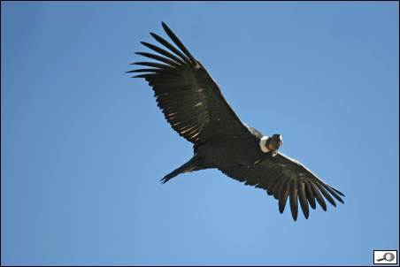 ![]() Kolem a kolem uváženo, je to vcelku nuda: pták na modrém pozadí. Na nebi tehdy svítil ještě Měsíc, ale nikdy se mi nepodařilo kondora přimět, aby se šikovně štrejchnul kolem něho. Motiv bez jakéhokoli měřítka ztrácí výpovědní hodnotu. Jiná situace nastala, když se ptáci pohybovali v linii horizontu. Tady muselo přát štěstí – na mě se neusmálo: