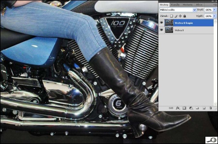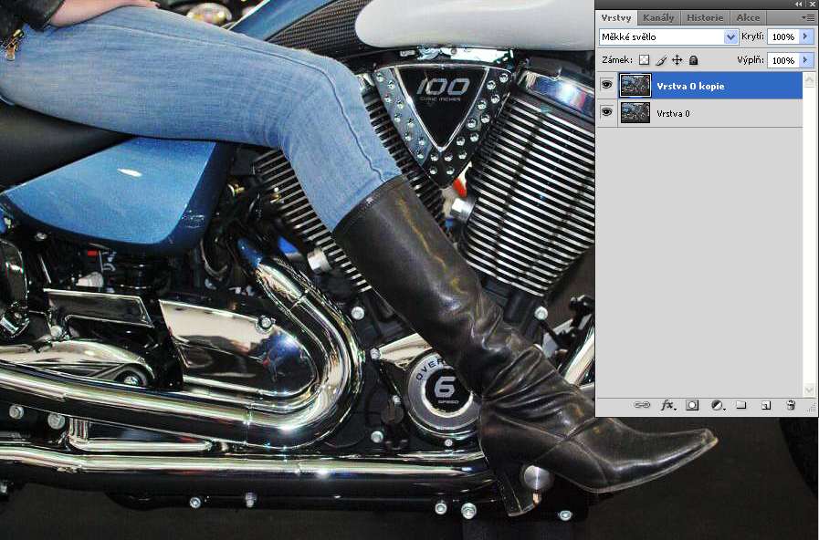Půjdeme tedy do Photoshopu (lze to udělat i v Elements, v našem oblíbeném Zoneru bohužel nikoli, potřebujeme vrstvy a masky). V prvním kroku převedu pozadí na vrstvu (nemusel bych, ale chtělo se mi) a vrstvu zduplikuji. Jedno z kouzel vrstev je prolnutí, to se nastavuje na kartě vrstev vlevo nahoře. Nastavím prolnutí měkké světlo a vida, obrázek se zvýraznil, zkontrastnil.