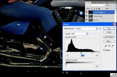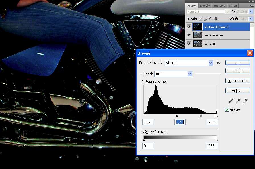 To mi bylo vždycky divné, kdo v Adobe vymyslel ty termíny… měkké světlo, proč? Obrázek je vždycky šťavnatější, kontrastnější. Ale toto přemýšlení přenechme historikům, máme teď fotku šťavnatou, ale jaksi bez tajemství. Udělám tedy další kopii, ona bude mít prolnutí zase “měkké světlo”, ale já si nastavím “normální”, tedy nebude se prolínat, bude vypadat úplně stejně, jako ta výchozí, zde vrstva 0. Tu ztmavím – zde v úrovních. Podotýkám, že se to dá dělat různými způsoby a tenhle možná není nejšikovnější, jde mi hlavně o názornost.