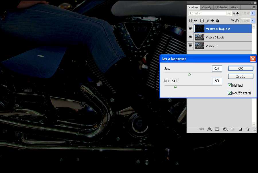 Obrázek hodně ztmavnul, ale aby byl tajemný, chci, aby byl ještě temnější a méně kontrastní. Takže si nastavím jas a kontrast, obé hodně do mínusu.