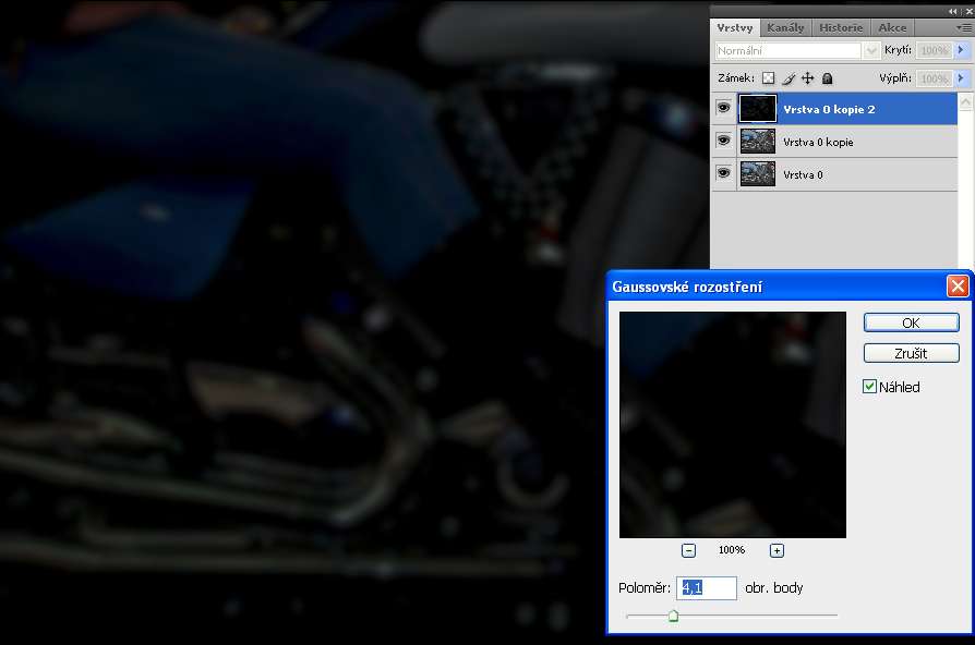 Je to tajemné? Chci to ponořit do mlhy. Od toho je dobrý filtr Gaussovské rozostření (tohle dovedou všechny lepší editory, najdete to ve Filtrech -> rozostření. Nastavím si podle libosti. Podotýkám pro ty, kdo by chtěli upravovat obrázek nedestruktivně, že jas, kontrast, úrovně, to vše se dá dělat ve vrstvě úprav, jenže filtry, potvory, destruktivní jsou vždycky, tedy, jakmile je aplikujeme, nelze je dál ladit (leda v nových Photoshopech, když je převedeme na inteligentní filtry, ale to bychom zacházeli moc daleko…). To jen na okraj. No a jsme na konci začátku, máme tmavou rozostřenou kopii a pod ní čeká zvýrazněný obrázek, pěkně kontrastní.