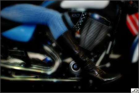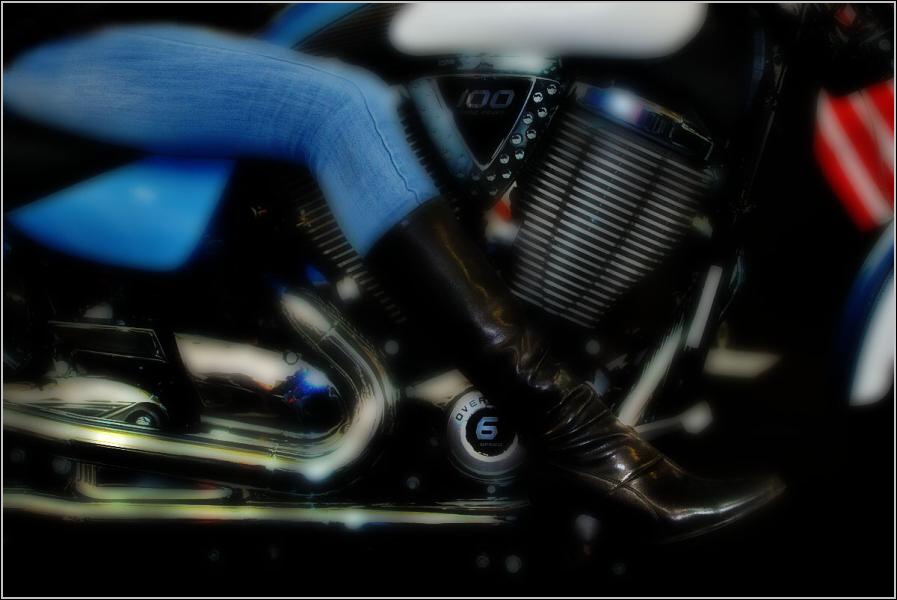 Je to fotka řešená podle mého gusta. Pojatá je plošně, tedy prostor tam nehraje roli, jen struktury a linie, přičemž dívčí noha tvoří silnou úhlopříčku z levého horního do pravého dolního rohu. Pak tu hrají roli struktury, kontrast kovových součástí motorky s texturou džín a kožené boty. Autor použil blesk, tím dosáhl plošného osvětlení a maximální dosažitelné ostrosti. Přemýšlel jsem, jak dát fotce víc šťávy a taky trochu tajemství: takhle je to tu všechno naservírováno jaksi prvoplánově, vše najednou.