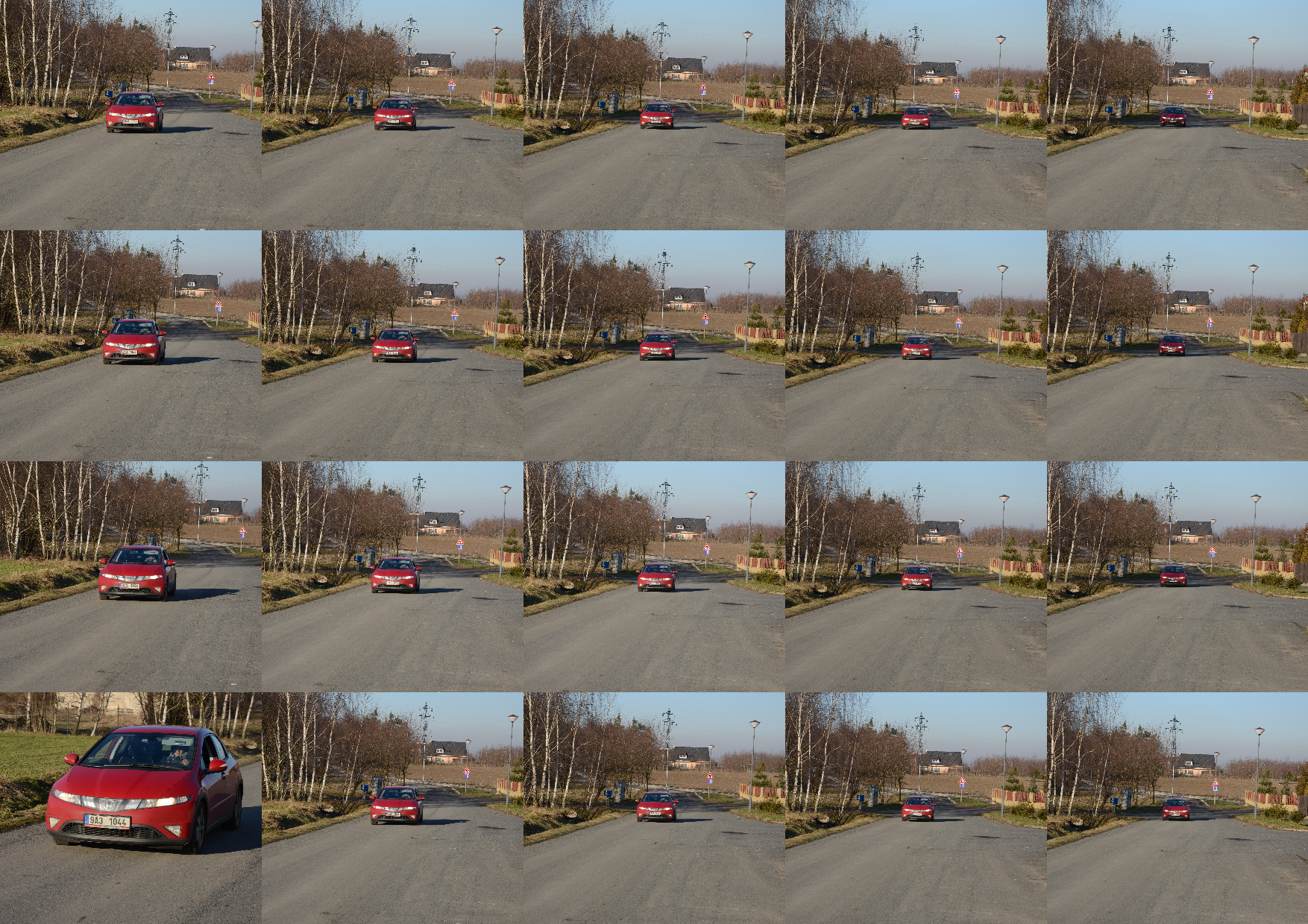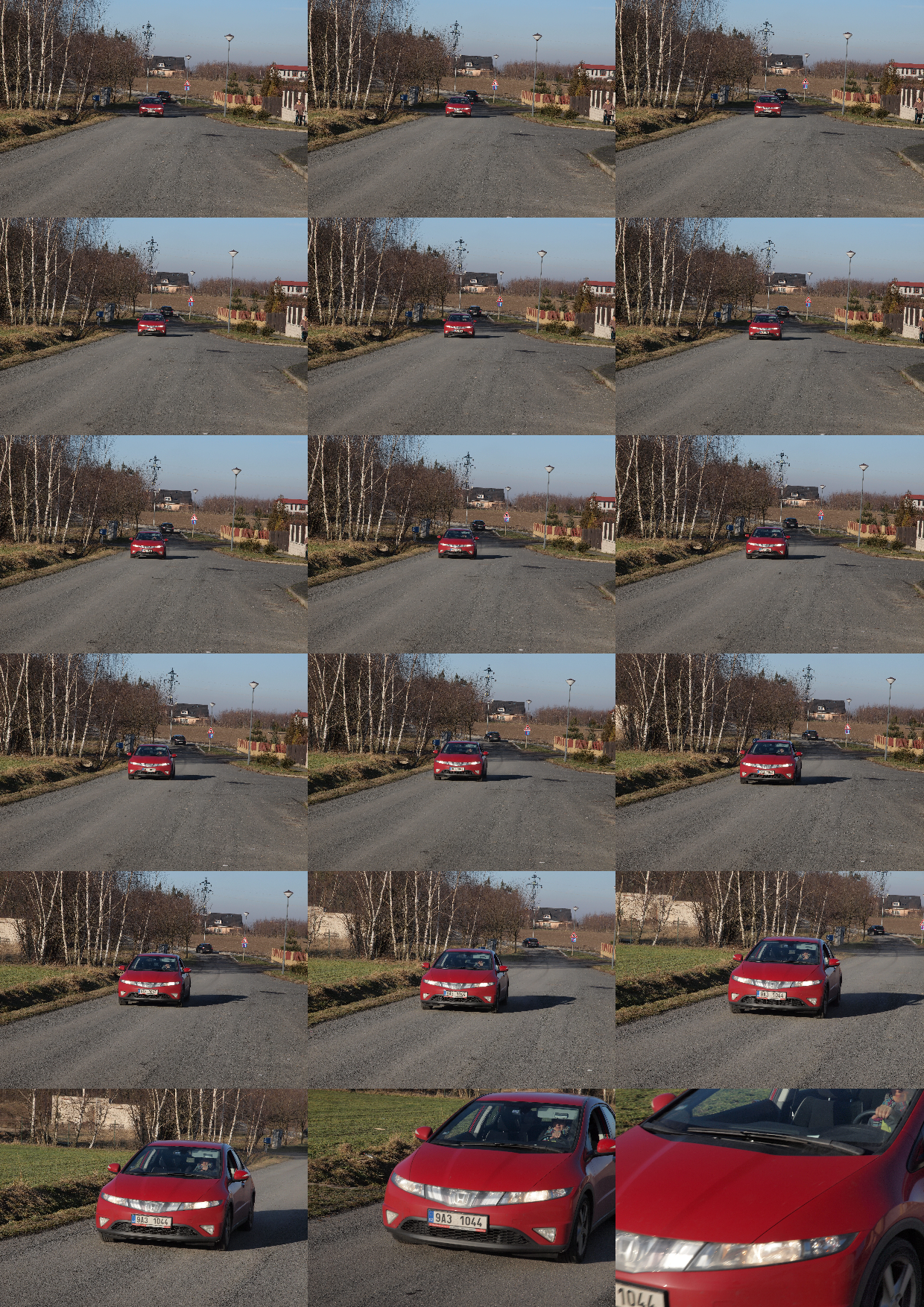 Jak uostří jedoucí auto? To nás jistě bude zajímat, fotíme automobilové závody a jiné podobné piškuntálie. Má rodná žena Ljuba Krbová se posadila za volant. Nastavil jsem průběžné (kontinuální ) ostření, manuální expozici, zvolil režim jednoho ostřícího bodu a ten nastavil na střed a ohnisko nastavil na ekvivalent cca 100 mm. Ljuba projela kolem mě rychlostí 50 km/hod. Výsledky byly prakticky shodné, všechny tři fotoaparáty ustíhaly ostřit naprosto uspokojivě.