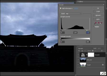 Slůvka k vysvětlení (kdo zná, může přeskočit ZDE). Jak s Elements ![]() Je to fotka, jak se říká, technicky dobrá tak asi na dvě věci. Pořízená za špatného počasí, v podstatě v protisvětle, zkrátka, fotka k vyhození. Řekl jsem, že “chválabohu” je pořízena v RAW. Můžeme se tedy pokusit z jednoho RAW obrázku vygenerovat dva dílčí snímky, jeden s optimalizovaným spodkem, druhý s optimalizovanou oblohou, a tyto dva snímky spojit dohromady. Otevřeme si RAW snímek v APE 7 (lze to i v nižších verzích, aktuální je sedmička), tedy přesněji v jeho RAW konvertoru, a tam ho expozičně vyladíme, přidáme trochu kontrastu, trochu živosti barev. O oblohu se nestaráme, a vůbec nás netrápí, že je obloha skoro celá vypálená (je to zvýrazněno červenou barvou, tam se kresba ztratila docela): ![]() Když je to hotovo, klikneme na tlačítko vpravo dole otevřít obraz a pak se obrázek otevře v editačním režimu APE. Jakmile se toto stane, jdeme nahoru do roletového menu a volíme soubor -> umístit. Po kliknutí na toto umístit se otevře adresář, kde máme uložený tento zpracovávaný RAW snímek a my ho znovu zvolíme. ![]() Opakuji pro lepší pochopení: volbou funkce umístit se zvolený snímek vloží do nové vrstvy už otevřeného snímku. Pakliže je zvolený snímek RAW (jako že v našem případě je), nejdřív ale musí projít procedurou v Adobe Raw Convertor. Tentokrát ztmavíme oblohu a zvýšením kontrastu ji uděláme dramatickou. Jdeme tak daleko, až zcela ztmavíme spodek, tedy stavbu, a zůstanou jen mraky. Vypadá to asi takto: ![]() Klikneme dole vpravo na tlačítko OK a v pracovním prostoru APE 7 se objeví “nová verze” téhož obrázku. Neděsme se toho, že bude “přeškrtnutá”, obrázek se proměnil v tzv. inteligentní objekt. Nebudeme si teď lámat hlavu, co to je. Stačí ta plochu obrazu poklepat kurzorem a přeškrtnutí zmizí a máme normální vrstvu. Nyní jde o to spojit obě vrstvy. V “normálním” Photoshopu bychom použili “prolnutí vrstev”. To však Eelements nedovedou, je to jedno z omezení tohoto programu. Musíme se tedy – v našem případě – zbavit temné siluety stavby. Víme, že odstraněním části obrazu v horní vrstvě je vidět to, co leží ve spodní vrstvě. Vymazat to? Tak to zkusme. ![]() Toho se pak těžko zbavujeme, v podstatě za cenu rozmazání anebo retuší. Je tu lepší metoda. Na spodní vrstvu aplikujeme vrstvu úprav. Aplikujeme ji klepnutím na ikonku “dělené kolečko”, je zvýrazněno červenou šipkou: ![]() Jakmile to uděláme, otevřeme nabídku, jaké úpravy lze dělat – my zvolíme třeba úrovně: ![]() Úrovně dobře známe, jimu můžeme po libosti zesvětlovat, ztmavovat nebo měnit kontrast. Zde však má vrstva úprav jinou funkci a proto je v podstatě jedno, kterou z úprav zvolíme. ![]() To bílé, ten obdélník vedle ikonky “ozubených koleček” je znamení masky. Protože je bílá, znamená to, že je celá vrstva viditelná. Volbou vrstvy úprav nám totiž nešlo o úpravy, ale právě o tu masku. Ta umožní to pravé kouzlení. V následujícím kroku je třeba vytvořit skupinu vrstev. V tom je ten trik: vrstva úprav, přesněji maska, je spojena se spodní vrstvou. Jenže mi ji spojíme i s vrchní vrstvou. Stiskneme klávesu Alt a klikneme na rozhraní mezi horní vrstvou a vrstvou úprav. Ikonka horní vrstvy poskočí o něco doprava. Na pracovní ploše vidíme horní vrstvu, třebaže na kartě vrstev není vyznačena černě – černá je vrstva úprav. Poté zvolíme nástroj štětec a černou barvou malujeme po tmavých partiích. Stane se zázrak – objeví se světlé partie vespod ležící vrstvy, maska začala fungovat, stala se pojítkem mezi oběma vrstvami: ![]() Štětcem teď odkryjeme vše, co má být světlé malováním po tmavé části černou barvou. Dá to trochu práce, trochu trpělivosti – zvlášť obtížné je retušování oněch kritických partií na přechodu. Ale rozhodně se zde pracuje lépe, než tou první primitivní metodou a hlavně – snadněji se opraví chyby. V paletě nástrojů lze snadno zaměňovat bílou a černou barvu a podle potřeby přidávat nebo ubírat tmavost. Trik na závěr: ![]() Tady je detail, pohled na kartu Vrstvy, kde je to všechno aplikováno: ![]() Chce si to vyzkoušet, psát si kuchařku – a proces aplikovat za různých situací. Každopádně je to zajímavý proces, který vede k nečekaným výsledkům. Tady máme to celé drama – a věřte, to počasí bylo fakt dramatické: ![]() Poznámka nakonec: |