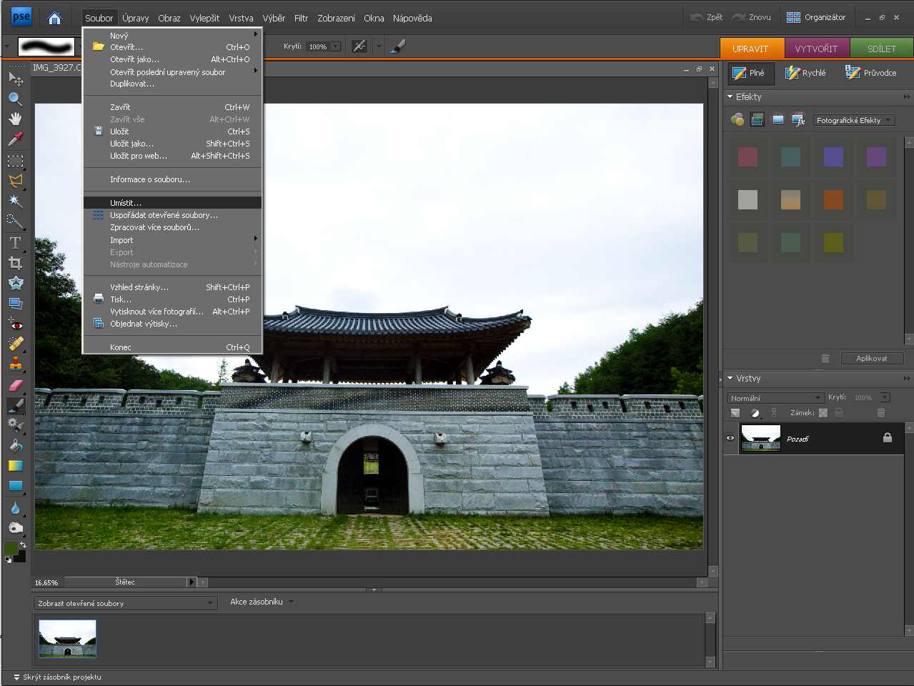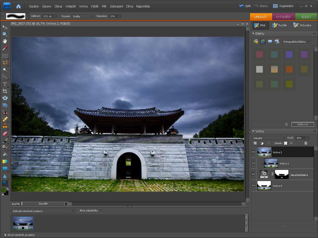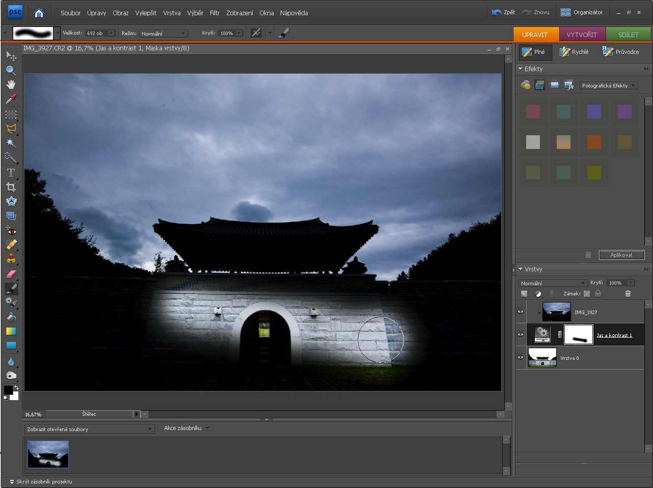 Slůvka k vysvětlení (kdo zná, může přeskočit ZDE). Jak s Elements ![]() Je to fotka, jak se říká, technicky dobrá tak asi na dvě věci. Pořízená za špatného počasí, v podstatě v protisvětle, zkrátka, fotka k vyhození. Řekl jsem, že “chválabohu” je pořízena v RAW. Můžeme se tedy pokusit z jednoho RAW obrázku vygenerovat dva dílčí snímky, jeden s optimalizovaným spodkem, druhý s optimalizovanou oblohou, a tyto dva snímky spojit dohromady. Otevřeme si RAW snímek v APE 7 (lze to i v nižších verzích, aktuální je sedmička), tedy přesněji v jeho RAW konvertoru, a tam ho expozičně vyladíme, přidáme trochu kontrastu, trochu živosti barev. O oblohu se nestaráme, a vůbec nás netrápí, že je obloha skoro celá vypálená (je to zvýrazněno červenou barvou, tam se kresba ztratila docela): ![]() Když je to hotovo, klikneme na tlačítko vpravo dole otevřít obraz a pak se obrázek otevře v editačním režimu APE. Jakmile se toto stane, jdeme nahoru do roletového menu a volíme soubor -> umístit. Po kliknutí na toto umístit se otevře adresář, kde máme uložený tento zpracovávaný RAW snímek a my ho znovu zvolíme. ![]() Opakuji pro lepší pochopení: volbou funkce umístit se zvolený snímek vloží do nové vrstvy už otevřeného snímku. Pakliže je zvolený snímek RAW (jako že v našem případě je), nejdřív ale musí projít procedurou v Adobe Raw Convertor. Tentokrát ztmavíme oblohu a zvýšením kontrastu ji uděláme dramatickou. Jdeme tak daleko, až zcela ztmavíme spodek, tedy stavbu, a zůstanou jen mraky. Vypadá to asi takto: ![]() Klikneme dole vpravo na tlačítko OK a v pracovním prostoru APE 7 se objeví “nová verze” téhož obrázku. Neděsme se toho, že bude “přeškrtnutá”, obrázek se proměnil v tzv. inteligentní objekt. Nebudeme si teď lámat hlavu, co to je. Stačí ta plochu obrazu poklepat kurzorem a přeškrtnutí zmizí a máme normální vrstvu. Nyní jde o to spojit obě vrstvy. V “normálním” Photoshopu bychom použili “prolnutí vrstev”. To však Eelements nedovedou, je to jedno z omezení tohoto programu. Musíme se tedy – v našem případě – zbavit temné siluety stavby. Víme, že odstraněním části obrazu v horní vrstvě je vidět to, co leží ve spodní vrstvě. Vymazat to? Tak to zkusme. ![]() Toho se pak těžko zbavujeme, v podstatě za cenu rozmazání anebo retuší. Je tu lepší metoda. Na spodní vrstvu aplikujeme vrstvu úprav. Aplikujeme ji klepnutím na ikonku “dělené kolečko”, je zvýrazněno červenou šipkou: ![]() Jakmile to uděláme, otevřeme nabídku, jaké úpravy lze dělat – my zvolíme třeba úrovně: ![]() Úrovně dobře známe, jimu můžeme po libosti zesvětlovat, ztmavovat nebo měnit kontrast. Zde však má vrstva úprav jinou funkci a proto je v podstatě jedno, kterou z úprav zvolíme. ![]() To bílé, ten obdélník vedle ikonky “ozubených koleček” je znamení masky. Protože je bílá, znamená to, že je celá vrstva viditelná. Volbou vrstvy úprav nám totiž nešlo o úpravy, ale právě o tu masku. Ta umožní to pravé kouzlení. V následujícím kroku je třeba vytvořit skupinu vrstev. V tom je ten trik: vrstva úprav, přesněji maska, je spojena se spodní vrstvou. Jenže mi ji spojíme i s vrchní vrstvou. Stiskneme klávesu Alt a klikneme na rozhraní mezi horní vrstvou a vrstvou úprav. Ikonka horní vrstvy poskočí o něco doprava. Na pracovní ploše vidíme horní vrstvu, třebaže na kartě vrstev není vyznačena černě – černá je vrstva úprav. Poté zvolíme nástroj štětec a černou barvou malujeme po tmavých partiích. Stane se zázrak – objeví se světlé partie vespod ležící vrstvy, maska začala fungovat, stala se pojítkem mezi oběma vrstvami: ![]() Štětcem teď odkryjeme vše, co má být světlé malováním po tmavé části černou barvou. Dá to trochu práce, trochu trpělivosti – zvlášť obtížné je retušování oněch kritických partií na přechodu. Ale rozhodně se zde pracuje lépe, než tou první primitivní metodou a hlavně – snadněji se opraví chyby. V paletě nástrojů lze snadno zaměňovat bílou a černou barvu a podle potřeby přidávat nebo ubírat tmavost. Trik na závěr: ![]() Tady je detail, pohled na kartu Vrstvy, kde je to všechno aplikováno: ![]() Chce si to vyzkoušet, psát si kuchařku – a proces aplikovat za různých situací. Každopádně je to zajímavý proces, který vede k nečekaným výsledkům. Tady máme to celé drama – a věřte, to počasí bylo fakt dramatické: ![]() Poznámka nakonec: |
