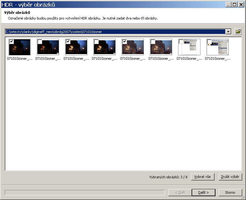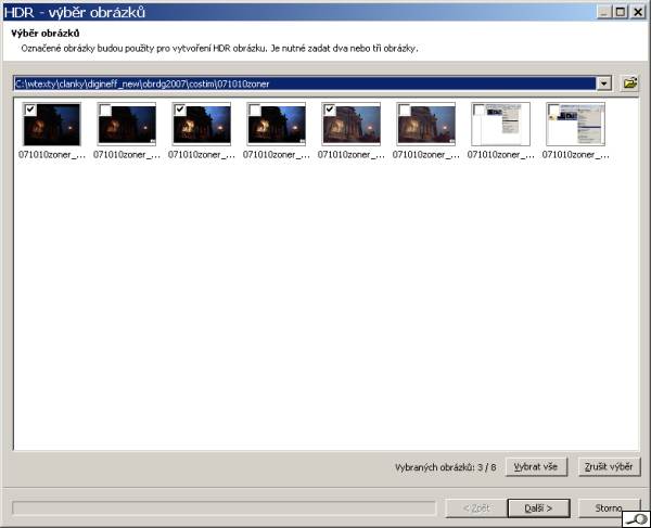 ![]() Aktivací funkce HDR (všimněte si, že je v publikační části, nikoli editační) získáme první okno, zde volíme, které snímky ve složce se zúčastní procesu. Pokud v Průzkumníku už před tím zaškrtneme ony snímky, objeví se i zde zaškrtnuté – tak je to i na naší ukázce. Snímky musí být dva, lépe tři: Následuje kontrolní náhled, kde bychom eventuálně mohli měnit pořadí, ale to zřetelně nemá žádný smysl. Konečně se dostaneme k závěru práce. Vlevo je ovládací aparát – v tomto případě, kdy obrázek je svou podstatou tmavý, je podstatná spodní část, týkající se stínů. Intenzita je ve výchozím nastavení vyjetá na 100 – v tomto případě nemělo smysl ji snižovat. Také nemělo smysl zvyšovat kontrast. Práh přechodu, plynulost přechodu a rozmazání masky, to jsou veličiny, které ovlivňují charakter spojení a liší se případ od případu. Poté, co schválíme náhled, klepnutím na tlačítko další se dostaneme už jen k poslední volbě – buď obrázek uložíme coby hotový, nebo ho ještě dál otevřeme v editoru pro další zpracování. Práce s tímto nástrojem je rychlá a snadná. Vidím jediný nedostatek – totiž, nelze tu dílčí snímky pasovat na sebe. Pokud je získáme z RAW obrázku, není co pasovat, ale při zpracování snímků pořízených ze stativu přece jen můžeme narazit na drobné nepřesnosti, které by pak vedly k nepříjemným dvojím konturám. Doufejme, že toto opomenutí bude napraveno v příští verzi Zoner Photo Studia. |