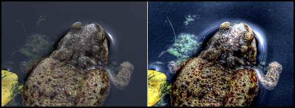 Vlevo je žába vyfocená jak je, vpravo zmapovaná (zmalovaná).