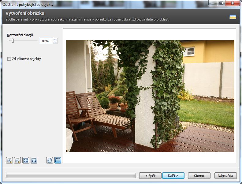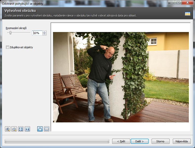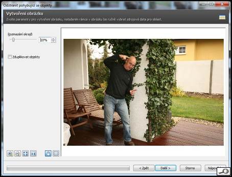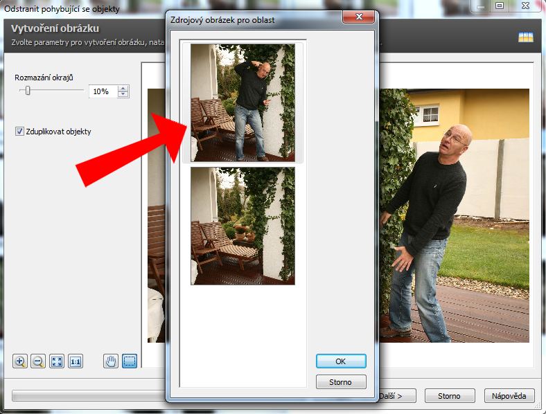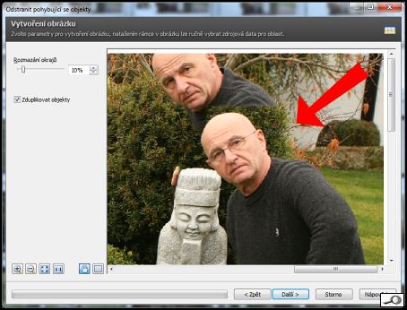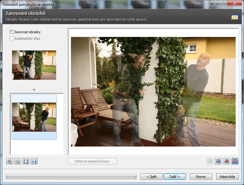 Je jasné, že na Wericha si nebudete chtít hrát moc často. Nicméně poměrně často chceme fotit nějaký statický objekt a vadí nám, že kolem něho chodí lidi nebo jezdí auta. Zkusme si tedy vytvořit z oné dvojice v ukázce nahoře výsledný obrázek bez lidské postavy. Zde má aplikace problémy, protože těžko určuje, co je pohyblivý objekt. Nicméně v praxi je to fotograficky jednodušší varianta, zkusme ji tedy.
