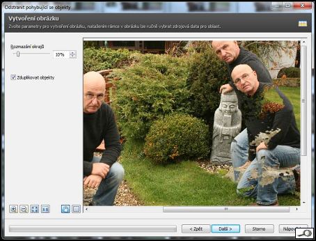 Jiná situace nastane, když se objekty zakrývají, tam už aplikace ví, kdo je ta škodná v revíru. Ovšem fotograficky je to obtížnější, protože těžko zabráníme zákrytům. Na další ukázce je vidět situace, kdy skládáme tři obrázky. Dvojice vpravo prosvítá a je skrz ni vidět pozadí.