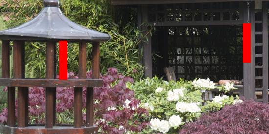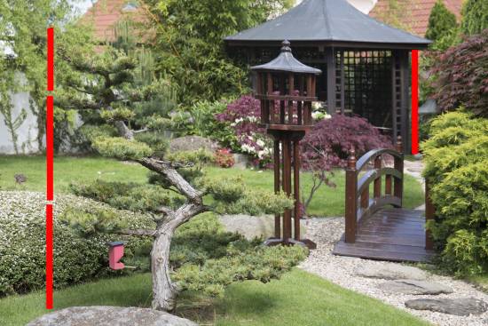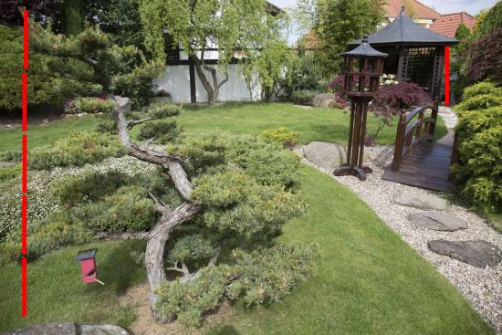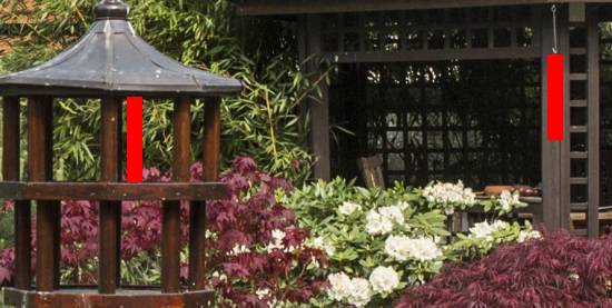 Asi se shodneme na tom, že horní obrázek vyvolá dojem větší prostorovosti než spodní. Když ale budeme měřit, zjistíme, že poměry vzdáleností se změnou ohniska (skoro) nezměnily. Udělal jsem výřezy z jednoho i druhého obrázku, a přenesl jsem výšku jednoho patra krmítka na altánek vzadu.